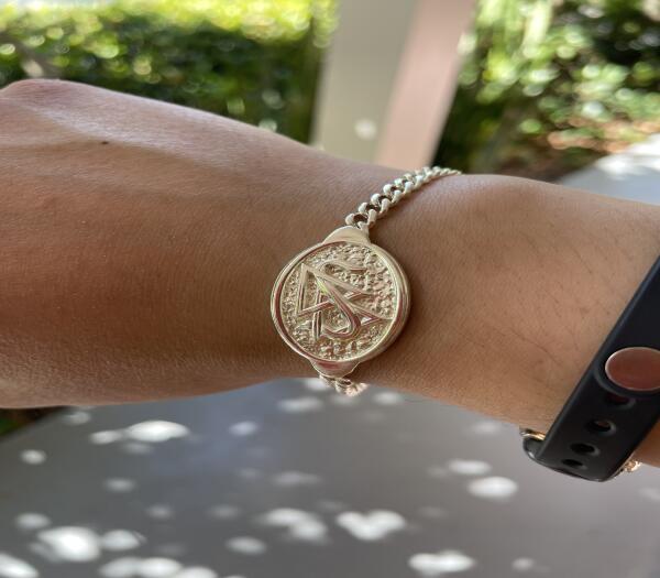 S and two triangles front of emblem. Chain link silver bracelet. Back of emblem says Nicole Barth 75,045