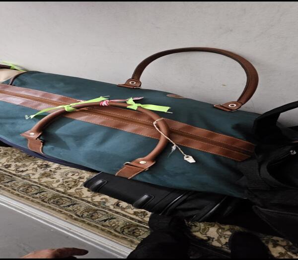 A green duffle bag (horizontally long) with brown handles, brown zipper, with 3 tags tied around one handle; 2 being neon yellow and the 1 in the middle being red and white striped.